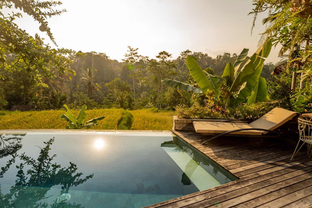 One Bedroom Private Pool with Rice Field Villas have a clear view of the rice field, the bedroom features a king size bed and the 140 m2 area, in addition to the beautiful outdoor area, lounge and chairs on the personal terrace, private swimming pool, outdoor bathtub, audio, air conditioning, and along with many other amenities, add to the comfort level of these villas.